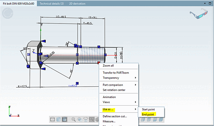 . If required, you can detach it as a separate window using drag & drop.-> The dimension points (blue) and connection points (green in individual parts, gray in assemblies) are now displayed.
