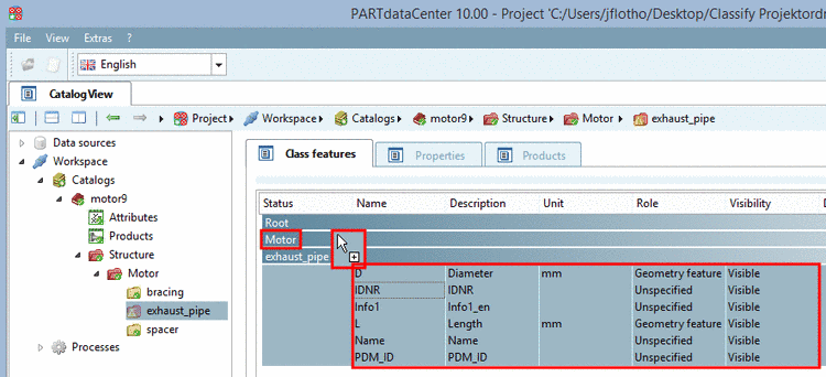 When selecting a class in the Structure view on the right side, the tabbed pages Class features, Products and Properties are displayed.