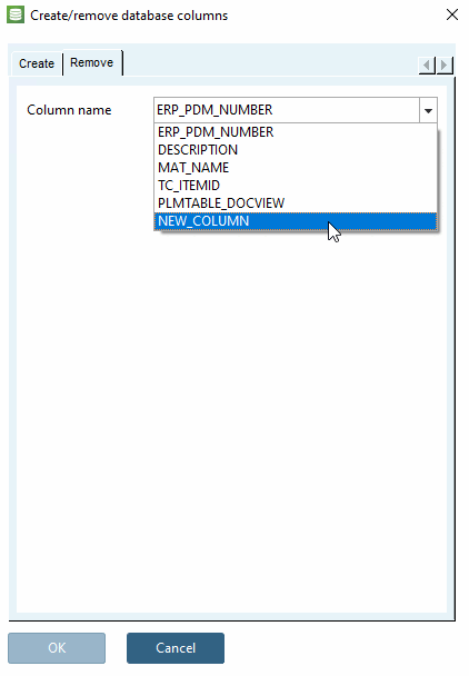 The columns ERP_PDM_NUMBER, MAT_NAME and DESCRIPTION are created with the standard installation.