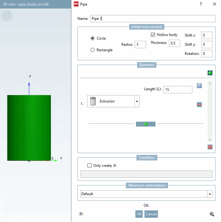 Wall thickness (T) [Thickness (T)]: Only active if the entire pipe is hollow (see Fig. „ Initial cross-section [Initial cross section] -> circle [Circle] “). If yes, a value must be entered.