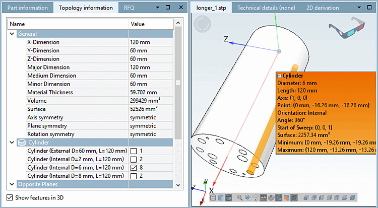 If you activate the Show features in 3D option, you can select a feature directly in the 3D view by clicking on it and display the topology information in the label (open by clicking on the plus sign). Click again to remove the selection. The check mark in the Topology information docking window is automatically set and removed again.