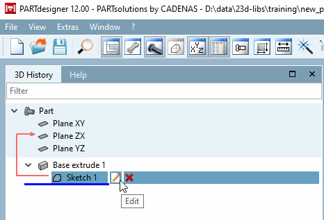 The 3D History docking window is a central "showplace" within the PARTdesigner. Its context menus are used to call up the Sketcher (with Sketch History [Sketch history] ) and create the component.