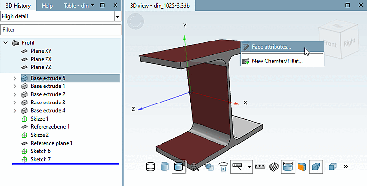 1. In the 3D view, hold down the Ctrl key and select three surfaces that are to receive the attribute and then click on the command Surface attributes.... [Face attributes...]