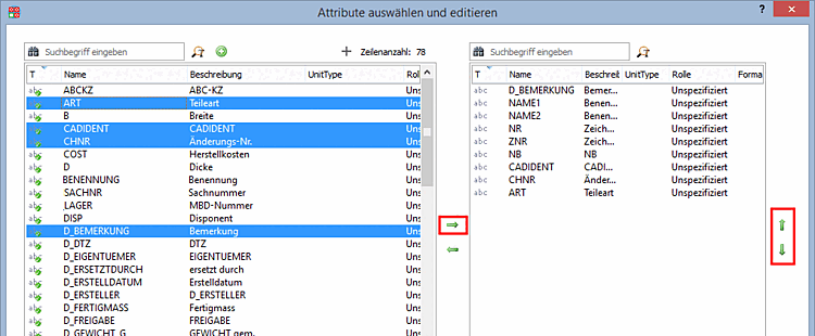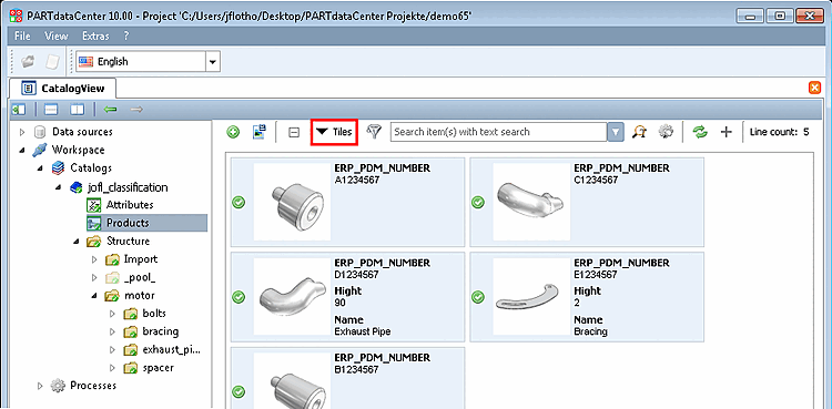 In the Table view type, all attribute names are listed one after the other in a single field. You can also perform a textual search of all products here. The total number of all products is displayed at the top right.