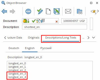 Additional long texts with counter number > 2 are displayed in the Object Browser under Descriptions/Long Texts on the corresponding language tab page.