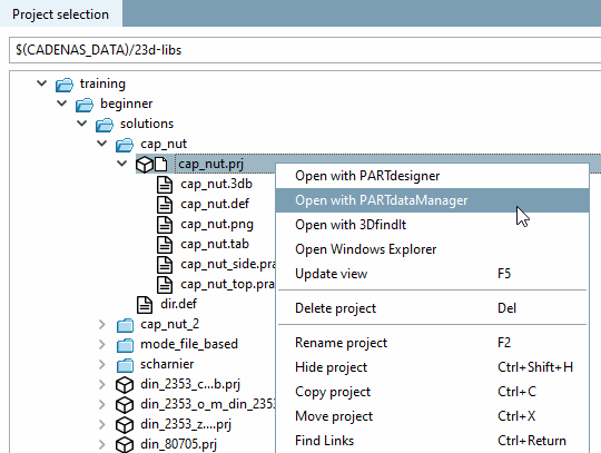 4. Switch to the project level and click on the context menu command Open with PARTdataManager.