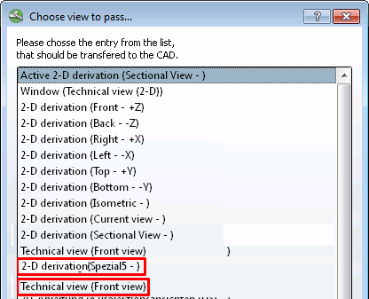 If specified by the manufacturer, additional derivations (in the example below "Special5") can also be transferred to the CAD system in the Select view to be transferred. [Choose view to pass...].. dialog box, additional derivations (in the example below "Special5") can also be transferred to the CAD system.