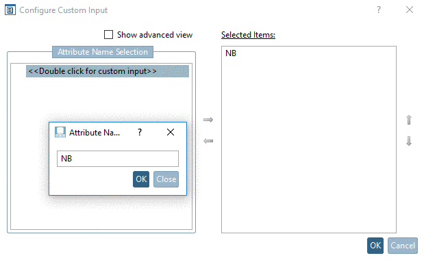 Double-click the entry under Attribute Name Selection and in the input field, enter the desired attribute name. When confirming with , it is automatically entered under Selected elements.