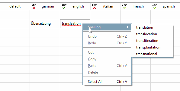 Click on the button at the top right above the table to activate the spell checker. Avoidably misspelled words are then underlined with a red line if they are not known to the dictionary.