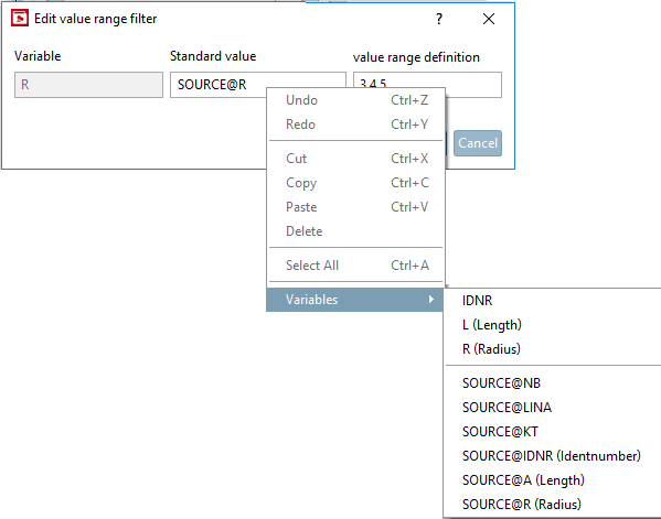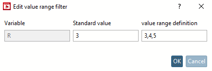 If a value range variable is selected as the variable, the Edit value range filter dialog box opens. Here you can select a default value [Standard value] and change the value range definition [value range definition] if required.