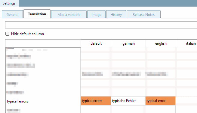 If there are no more differences, the default [english] column is hidden. All changes made in the default language column are also transferred to the default column, even if it is hidden. If you switch from a project in which the checkbox is activated to another project, the columns are also compared so that no hidden differences can occur between the two columns.