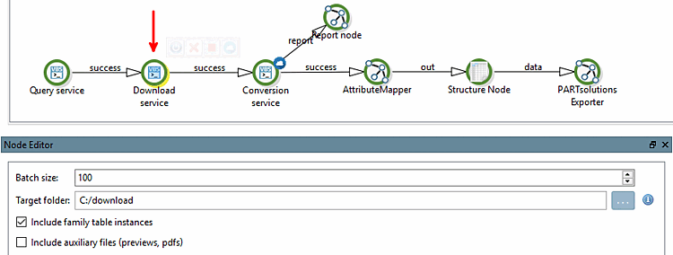 If the pipeline is executed locally, i.e. without PARTapplicationServer, then please select a value for Download Service in the node editor [Node Editor] under Batch size in the amount of the parts to be processed.