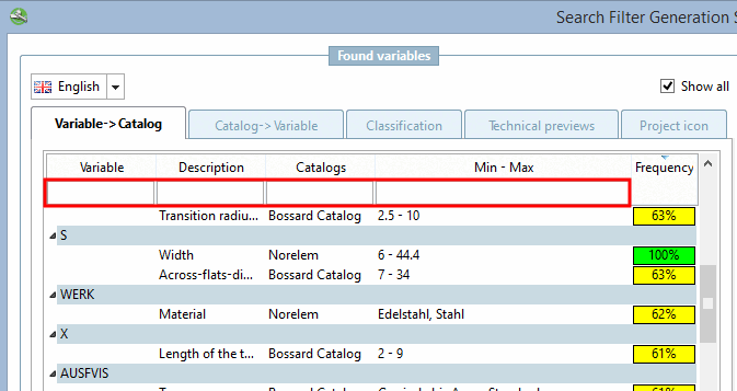 If Show all is deactivated, the filter variables already selected are hidden on the left-hand side of the dialog under Variables of scanned parts [Found variables].