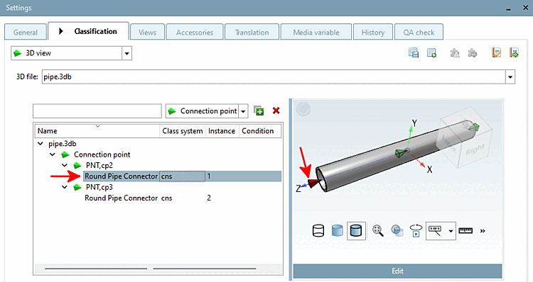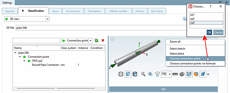 In practice, a large number of classifications are made using connection points (e.g. for pipe connections). See also Section 5.12.8, “ Classify standard parts for placement dialog ”.
