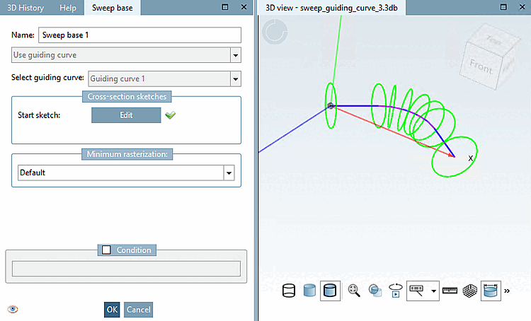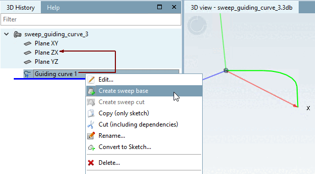 Guiding curve, click on the Create basic curve [Create sweep base] command.Create the cross-section sketch.