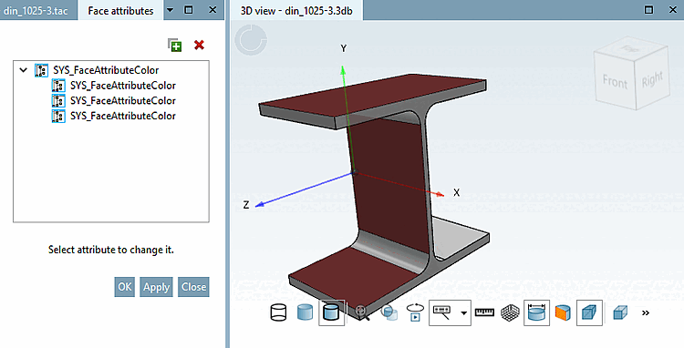 In the 3D view, hold down the Ctrl key and select three surfaces that are to receive the attribute and then click on the command Surface attributes.... [Face attributes...]