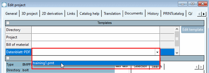 media.cfgwith the following content in the directory "_templates" should have been created automatically.TMPLATETYPES] DIR=Directory PRJ=Project BOM=BOM PDF=Datasheet PDF As soon asthe entry "PDF=Datasheet PDF" is available, the entry Datasheet PDF is displayed in PARTproject the entry Data sheet PDF is displayed in the Templates section.