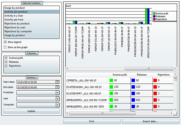 The Occupancy by product [Usage by product] statistic shows the maximum available floating licenses and the maximum number of occupancies in the set period for all available products listed individually. If the number of floating [In use (floating)] licenses is very close to the number of available licenses, an increase in capacity should be considered, even if no rejections have yet occurred. See also the statistics types Rejections per product [Rejections by product], Rejections per user [Rejections by user] and Rejections per computer [Rejections by computer].
