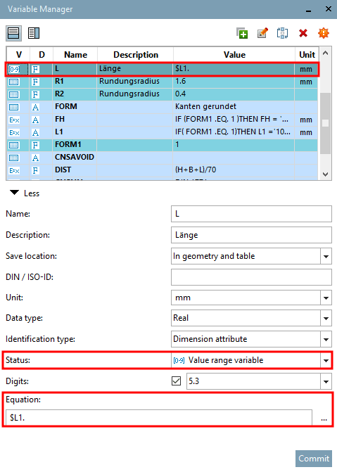 In the following example, the value range under L is to be displayed depending on the value under FORM (or FORM1 ). For "Edges rounded" [1:6000], for "Edges sharp" [1:2000].