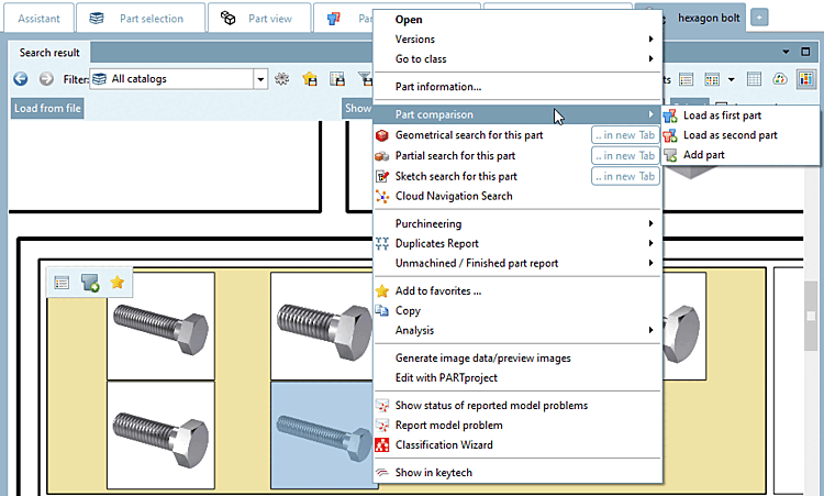 changes and the component is loaded in the component comparison.If you release the mouse button over the Part comparison tab within a second, the part is accepted, but there is no switch to the part comparison, so that you can select further parts, for example.