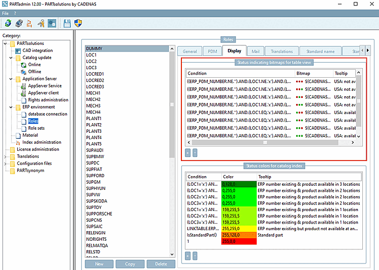 Setting in the user interface under PARTadmin -> Category Roles -> Display tab -> Status colors for table [Status indicating bitmaps for table view] dialog area: