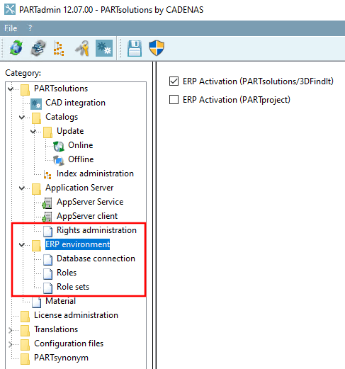 When setting up the ERP environment, the connection to LinkDB is set in the Database connection subcategory, the mapping of users/groups [Users/groups] to role records [Role sets] in the Rights management [Rights administration] category and the mapping to roles [Roles] in the Role records [Role sets] category. The specific settings, such as export conditions [Export condition], are made in the Roles category.