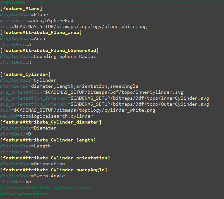 In the config blocks of the features, the order of the attributes to be displayed is defined in the "attributes " key. If this key is omitted, all attributes of the feature are used in the internal order by default. The attributes of the features can be expanded in the same way as the global attributes. In the config blocks of feature attributes, the prefix "featureAttribute_" is followed by the name of the feature (e.g. "Cylinder_") and then the name of the attribute (e.g. "diameter").