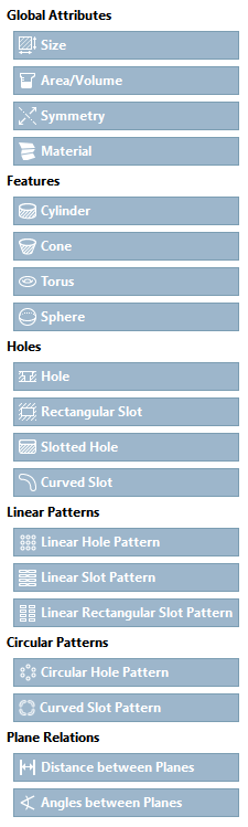 The listed features and global attribute groups (globalAttributeGroups) within the categories are specified in detail in other blocks of the config (e.g. [feature_Cylinder] or [globalAttributeGroup_symmetry]). Both global attribute groups and features can be added to a category.