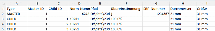 Example for CSV result table with standard variables and variable type "Topology" with two attributes (Cylinder and RoundHole):