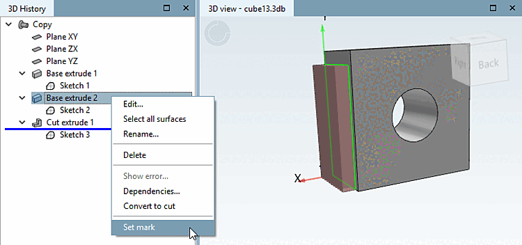 In the 3D history [3D History] docking window, you can "jump" to any point in the construction process by moving the blue horizontal line. This means that the 3D view shows the component in the corresponding design phase.
