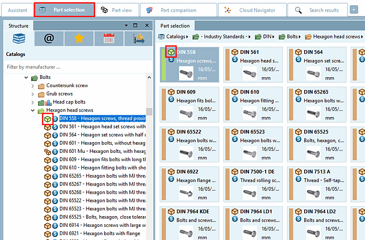 For example, select the sub-item Catalogs or Classifications on the Parts selection [Part selection] tab page and search the respective directory structure for the desired part.