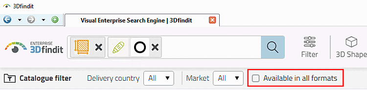 Filter search across all catalogs also includes catalogs linked to the manufacturer, Available in all formats refers only to catalogs created with CADENAS technology. If ALL catalogs are displayed, you can distinguish them by the catalog icon.