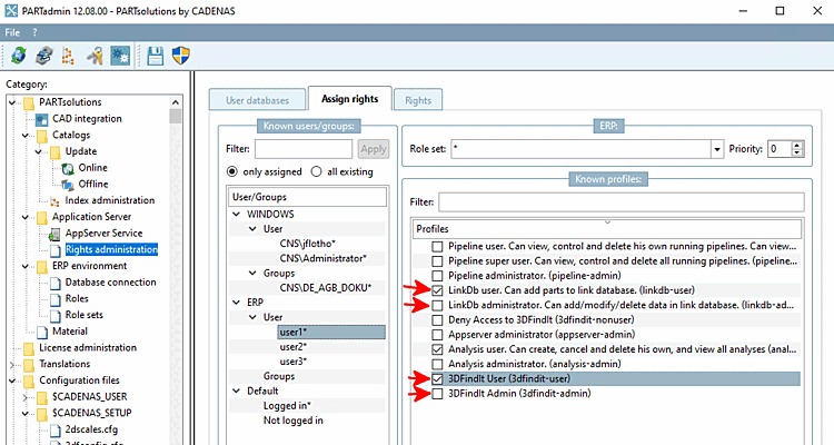 If a user (here "user1") shall use 3Dfindit, make sure that under Known profiles "3DFindit User" is enabled.