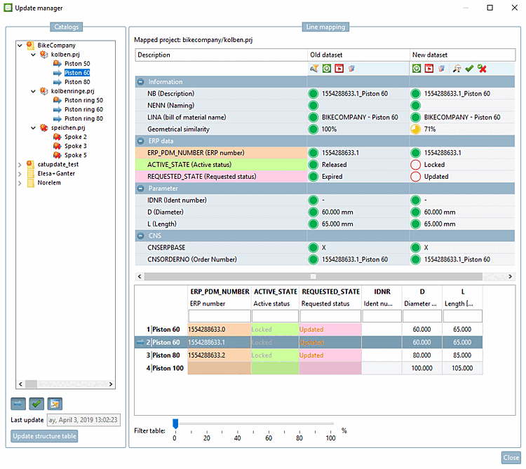 In the Catalogs area, you will see symbols at directory, project and line level that indicate certain changes. You will find a detailed description in the following sections.