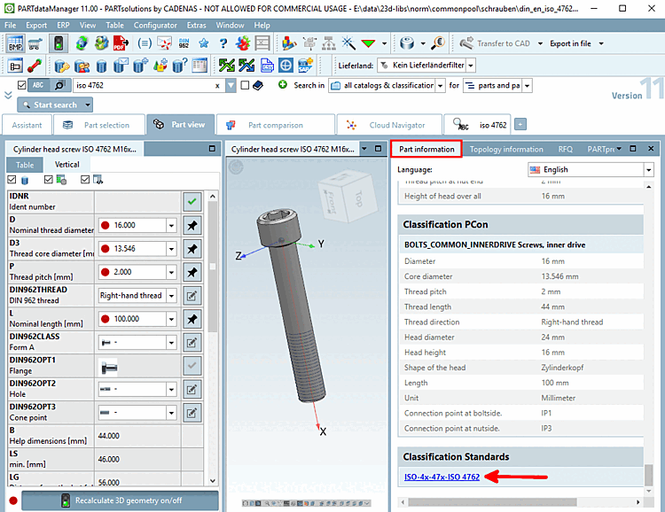Click on a link to open the part in the part selection [Part selection], in the classification structure.