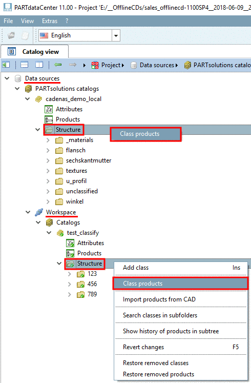 Semi-automatic classing works both on PARTwarehouse catalogs under Workspace and directly on PARTsolutions catalogs under Data sources. The following description is based on classing under Data sources.