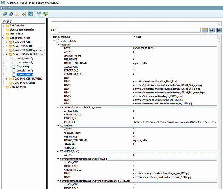 Settings in PARTadmin , under Category, make configuration files [Configuration files] → $CADENAS_DATA/datasetup → replace_std.cfg .