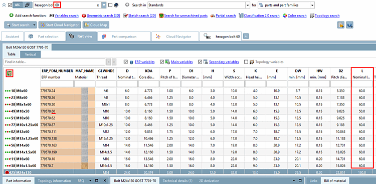 You can target specific characteristics when searching, for example by specifying parameters in the full text search [Full-text search] or using a geometric search (3D) [Geometric search (3D)].