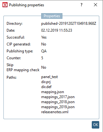 Here you can see the properties used for publishing. Of particular interest with partial publishing under Paths is the list of marked folders or selected files.