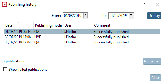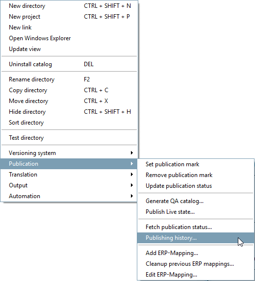 2. Click on the context menu command Publishing history. [Publishing history...].. (only on catalog directory).