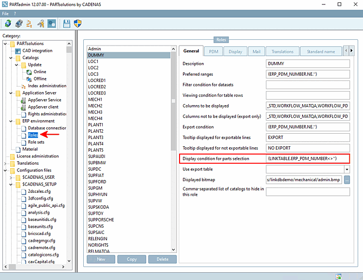 As a rule, it makes sense to set the condition for the preferred series [Preferred ranges] and the display condition for part selection [Display condition for parts selection] in the same direction. See Section 4.7.4.1.2, “ Preferred series - plinkgroups.cfg -> Block [Role_name] -> Key "PREFRANGE" ”. Example: Preferred series [Preferred ranges] and display condition for part selection [Display condition for parts selection] are both based on the existence of an ERP number.
