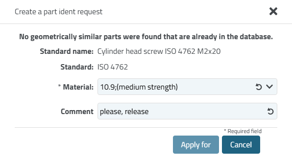 Fill in the fields and click on the button. In this example, the fields are Material and Comment, but there can be any number depending on the configuration. You can also enter in the comment field, for example, that a specific variant is required.