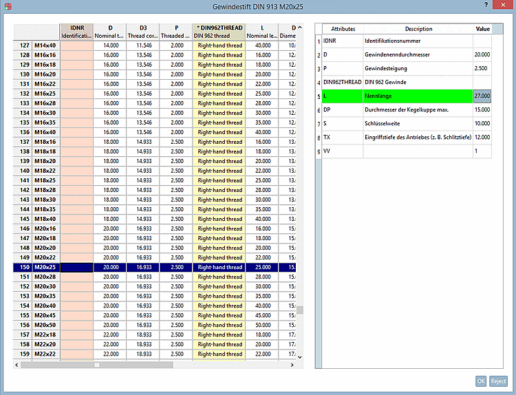 The CSV line with the ident number 10 shows DIN 913 and the dimension M20x27.