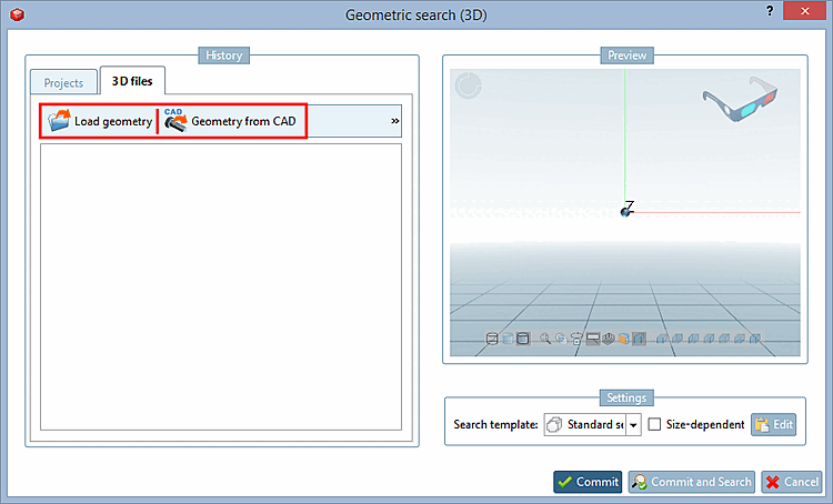 When clicking on Geometric search (3D) the same-named dialog box opens.