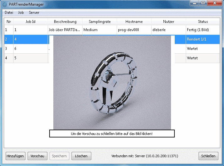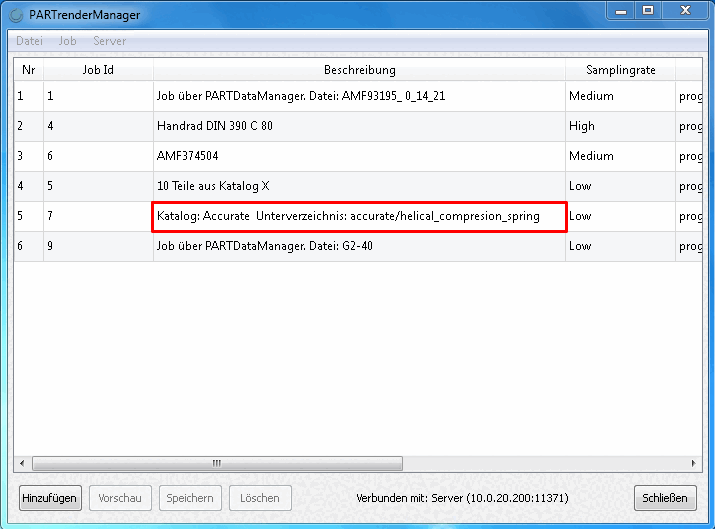 The jobs in the list are always transferred from the server and displayed in such a way that the jobs that have already been completed come first. They are followed by the job that is currently being processed by the server and finally the waiting jobs whose images have not yet been calculated. The index number numbers the entire list and only plays a role for the waiting jobs, as it can be used to change the sequence. The number can be changed by double-clicking and a job can be moved up in the list so that it is processed earlier by the server.