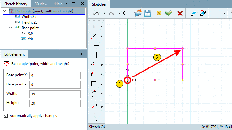 -> In the docking window Edit element, now the view changes to Insert hexagon. Here, you can adjust Width across flats, furthermore, also here, the center point of the hexagon via Center point X and Center point Y.