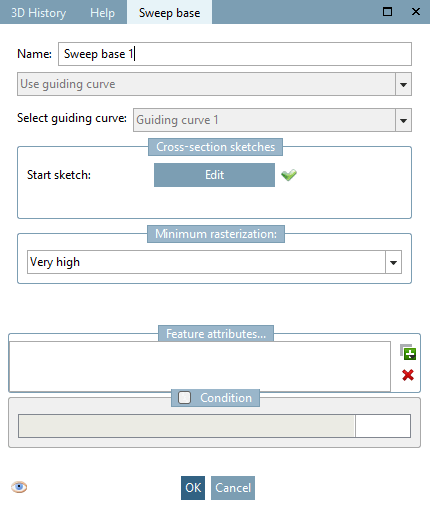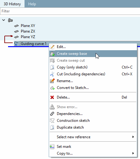 In the context menu of Guiding sketch, click on the Create basic history [Create sweep base] command.
