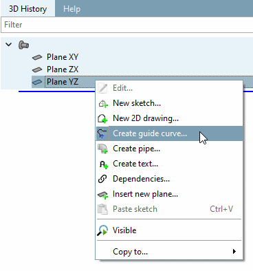 On the 3D history [3D History] tab page, click on the context menu command New history curve.... [Create guide curve...]