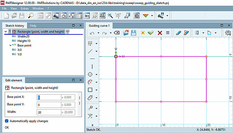 Apply changes [Accept changes].-> On the Basic history [Sweep base] tab page, a green tick is now visible under Start sketch.