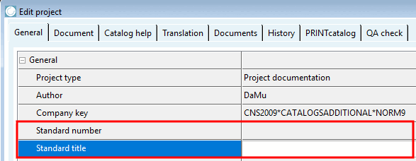 For projects without a table (e.g. document projects), there are also the fields Standard number (e.g. DIN 404) and Standard title (e.g. "Cross-hole screw with slot").